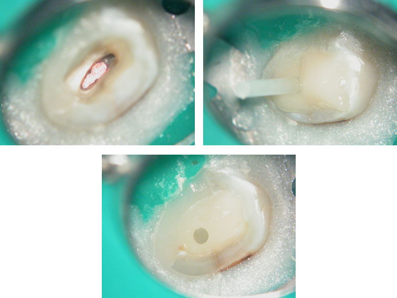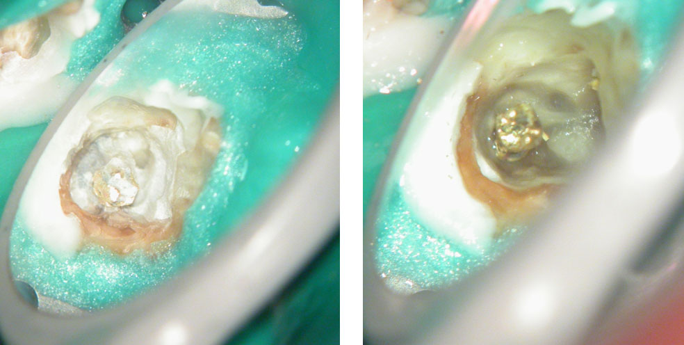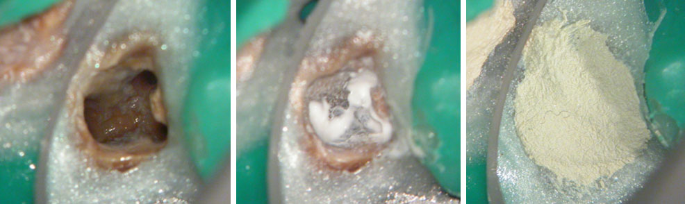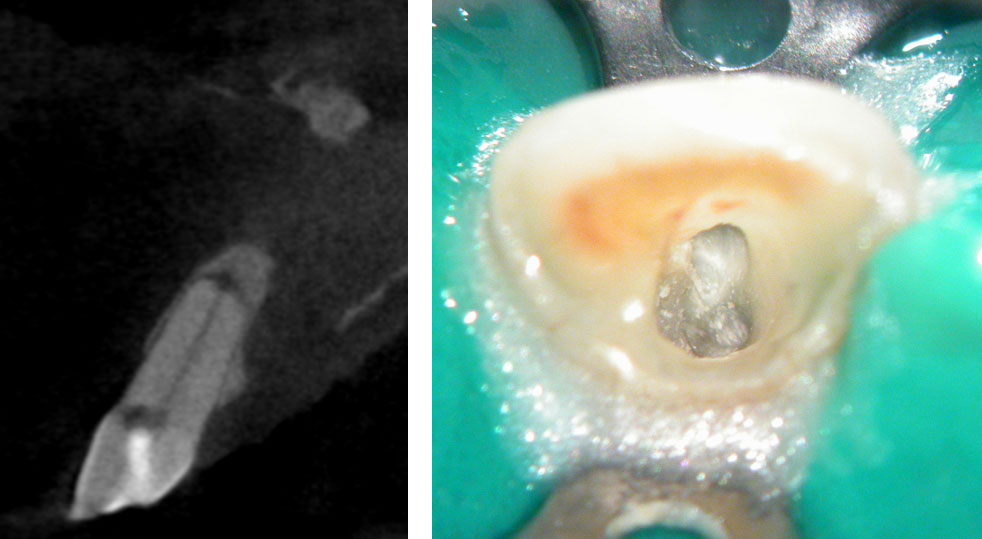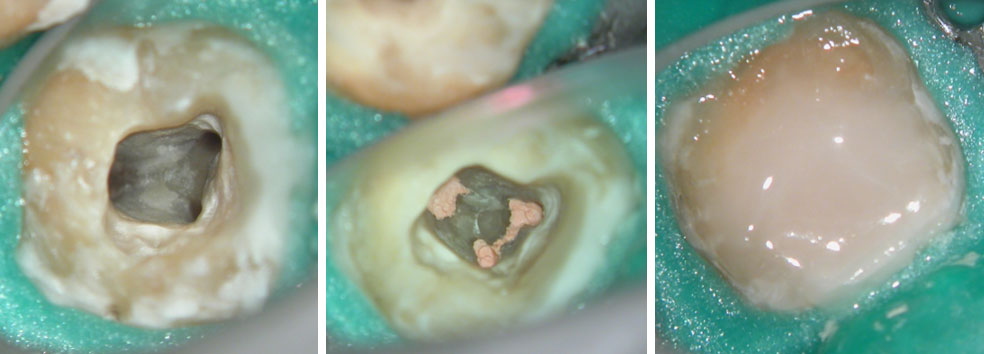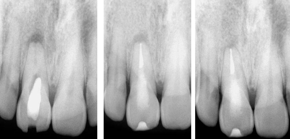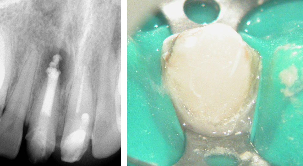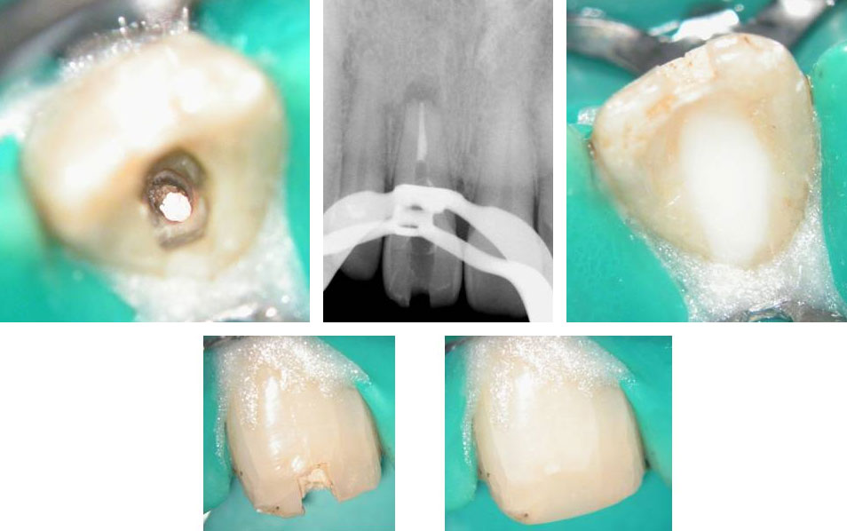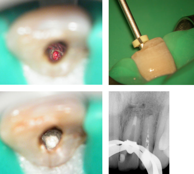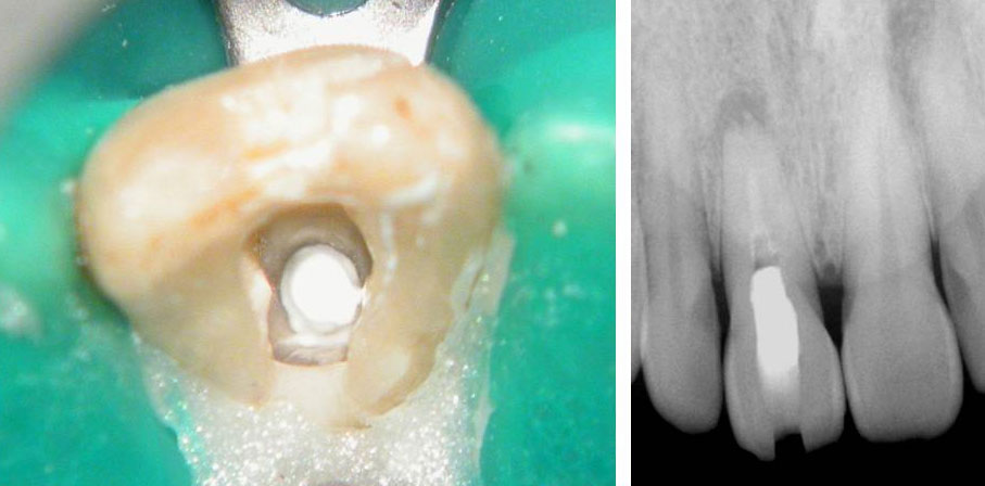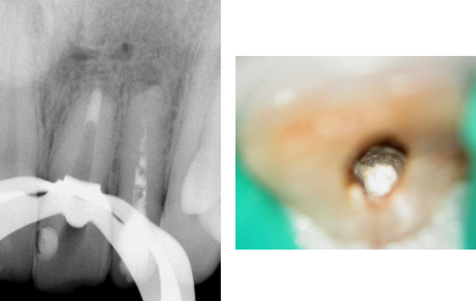 • Right Central Incisor: Remove old filling. Fill entire canal with MTA. Core build-up with Composite.