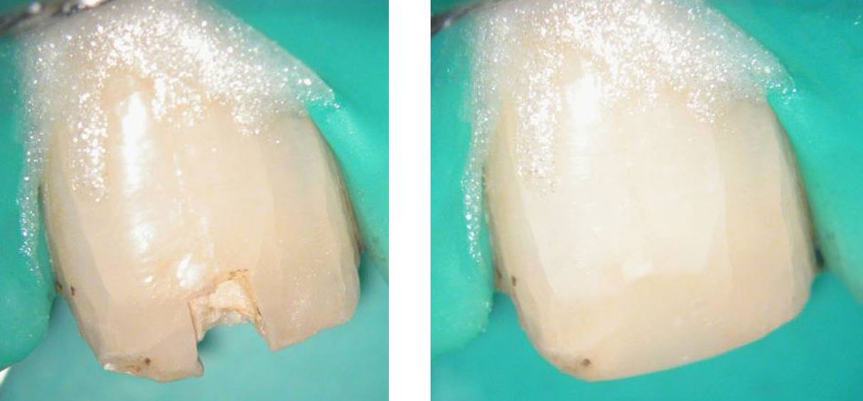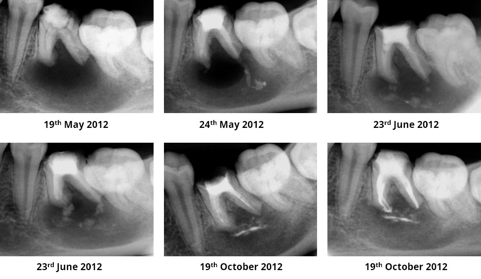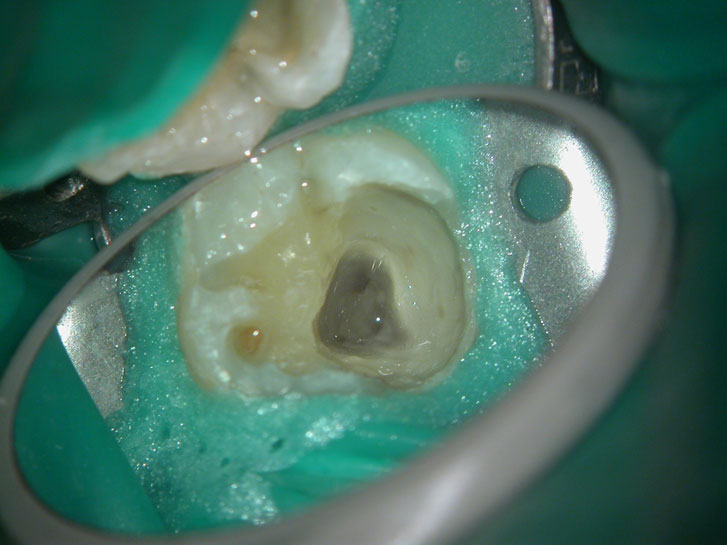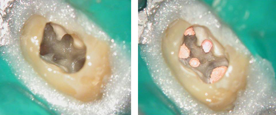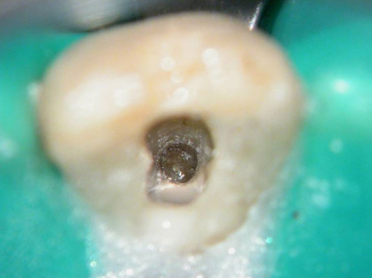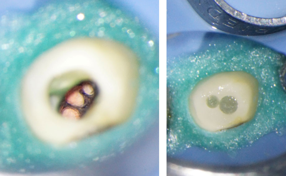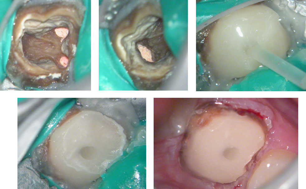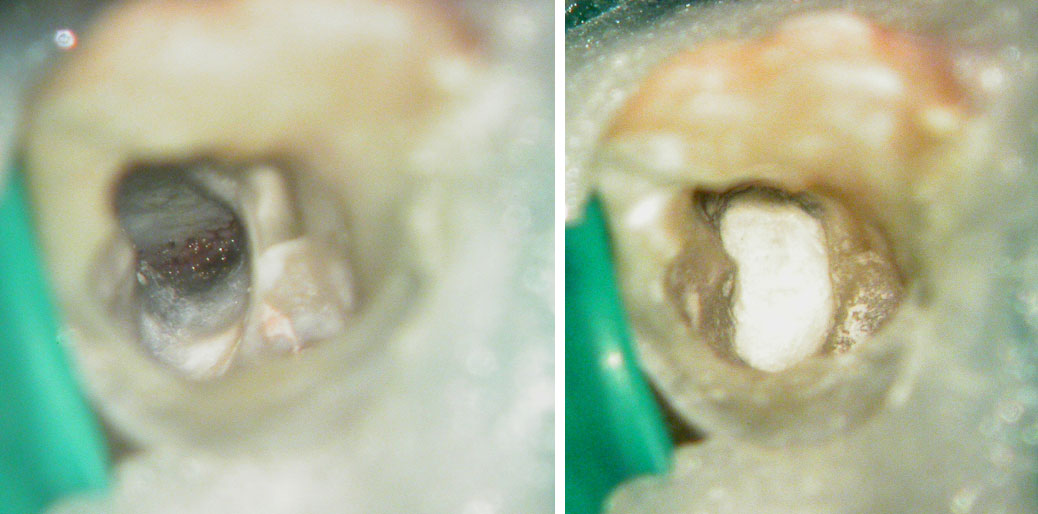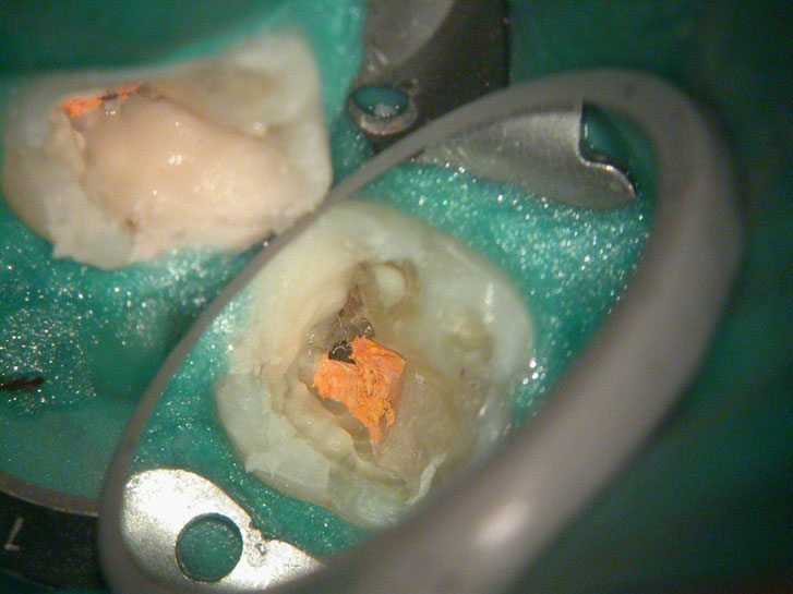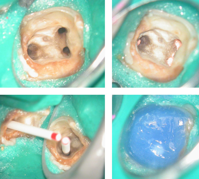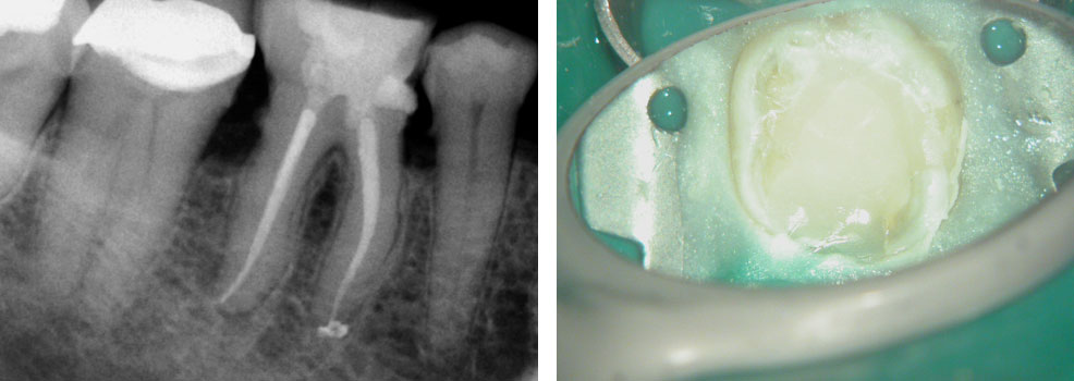 • Right Central Incisor: Remove old filling. Fill entire canal with MTA. Core build-up with Composite.