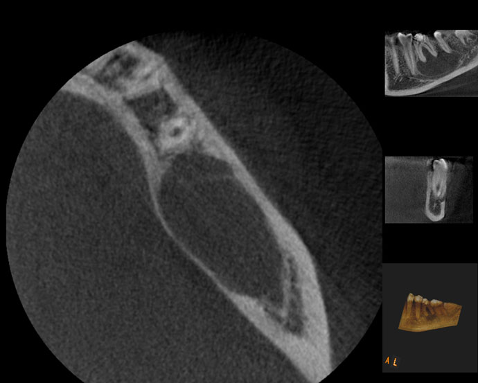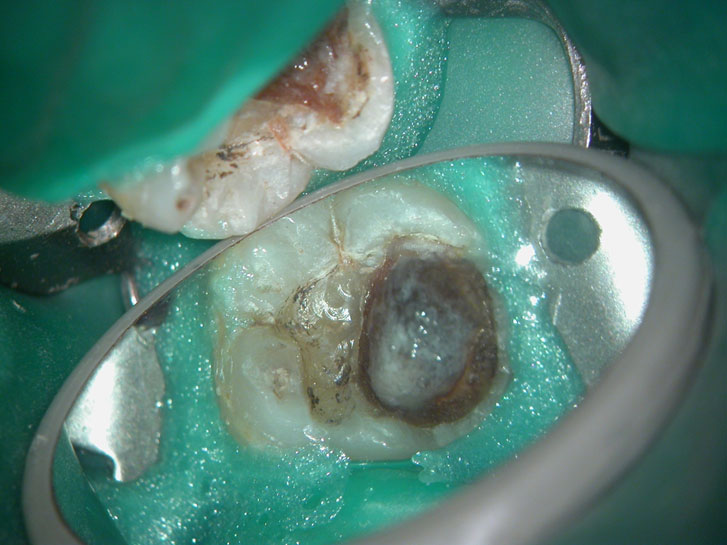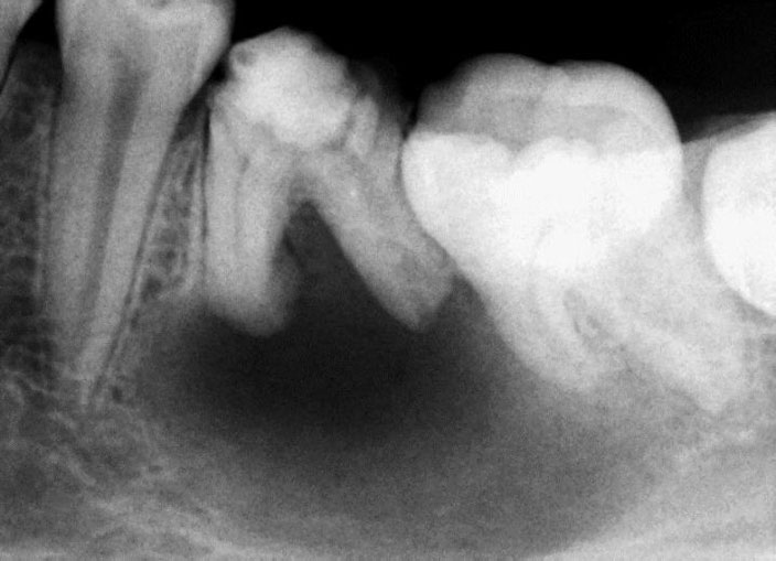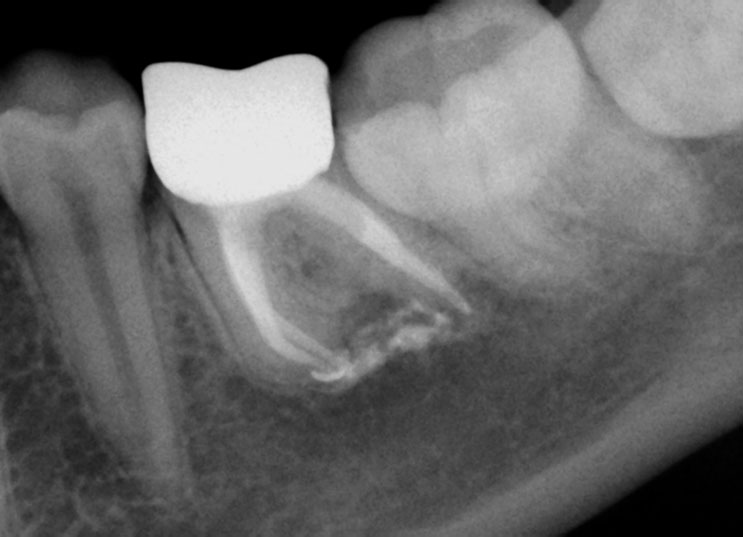 Tooth: left mandibular first molar. Poor restorative prognosis. Very large lesion.