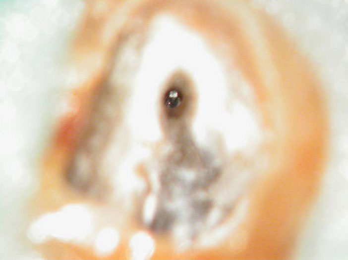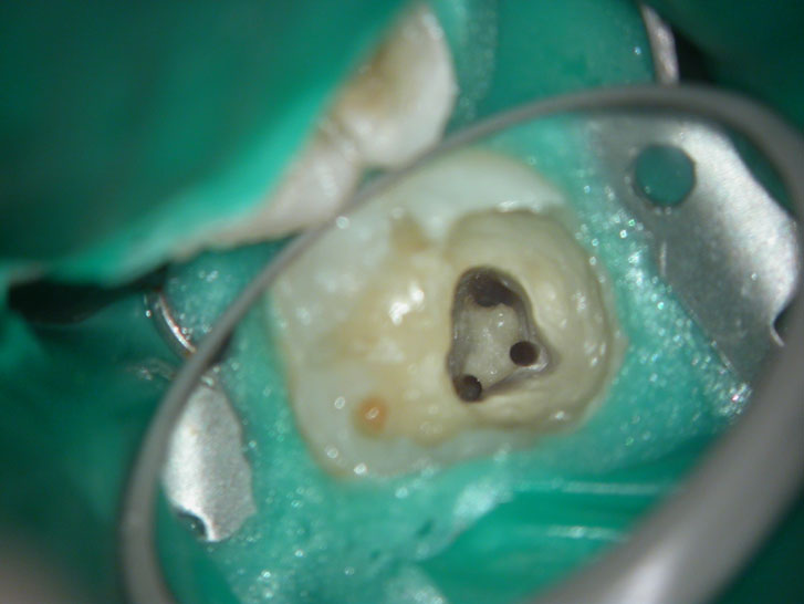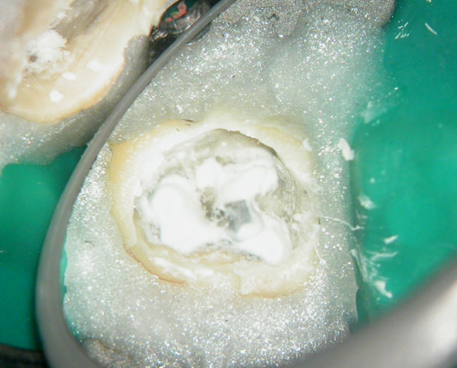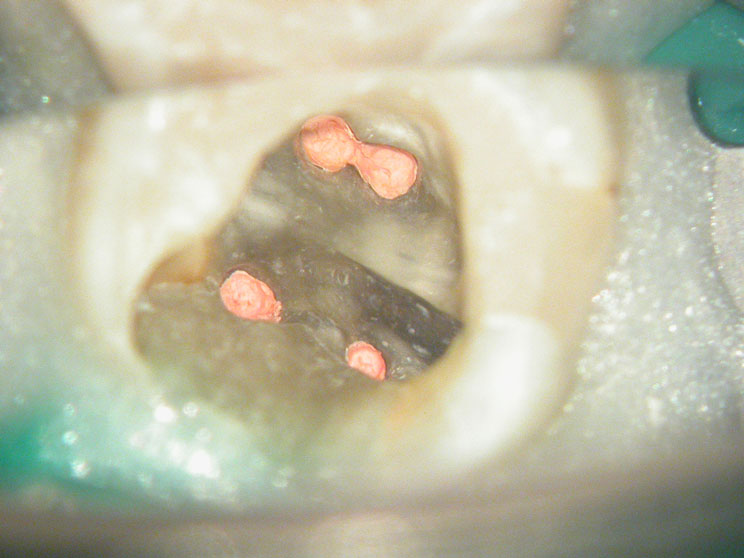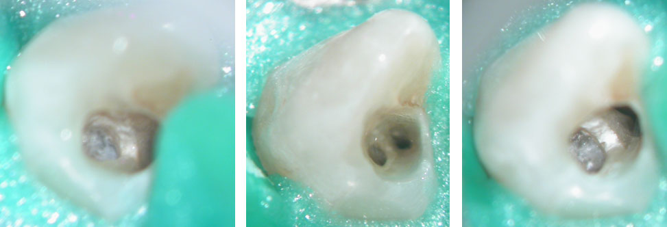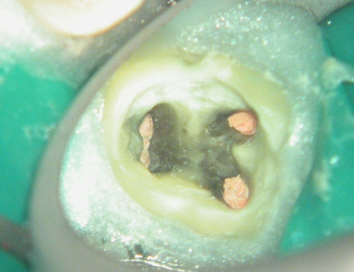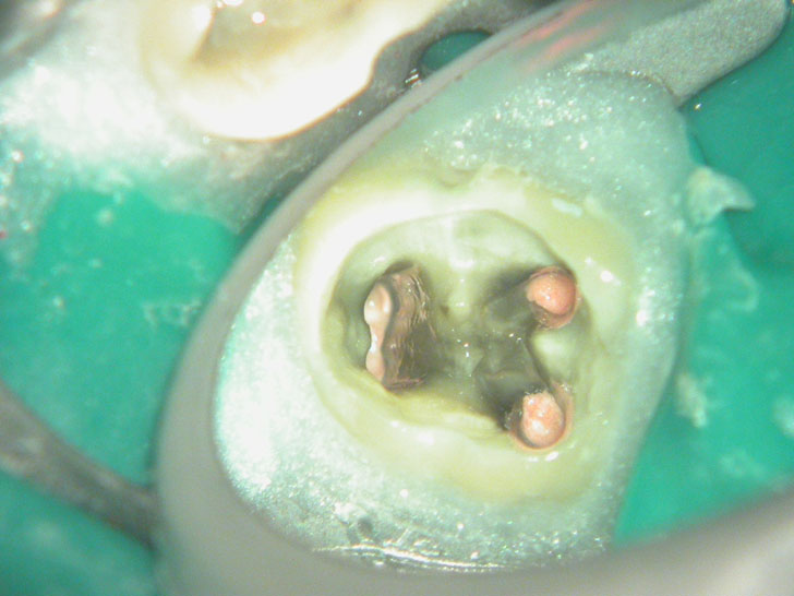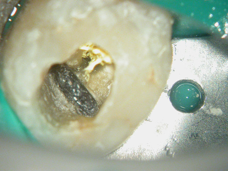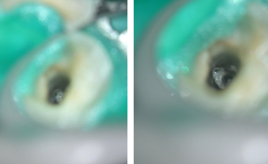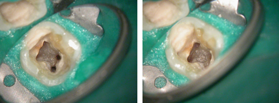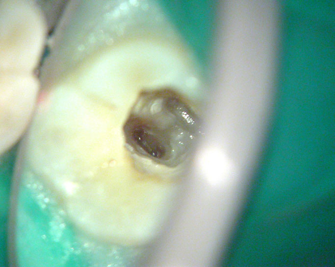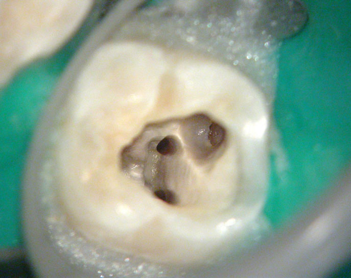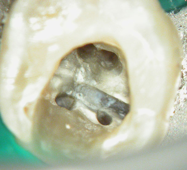 Removal of pulp stone reveals an untreated distal canal which was (surprisingly) vital and hyperaemic