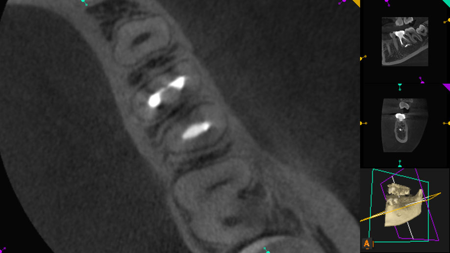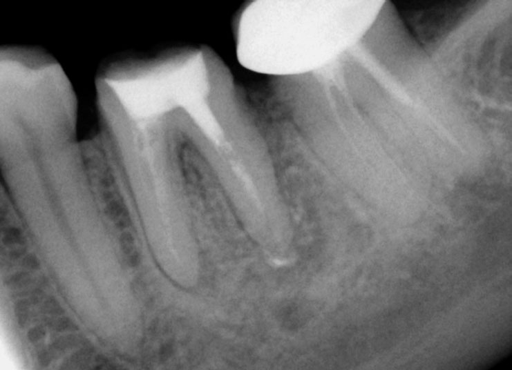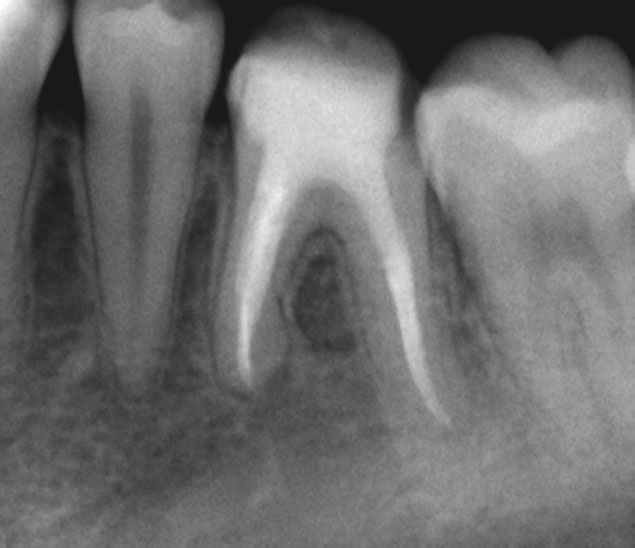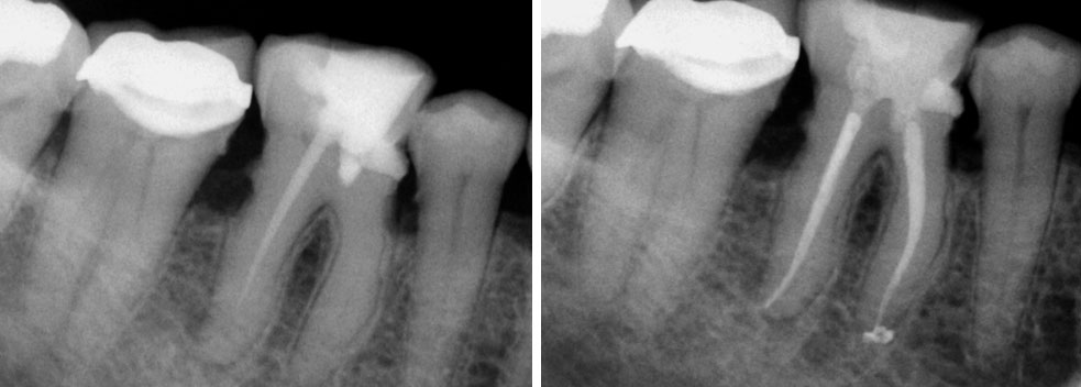 Pain in mandibular first molar after endo. Previous dentist unable to locate mesial canals. Obturated only the distal canal. Patient has generalized periodontal problems as well.