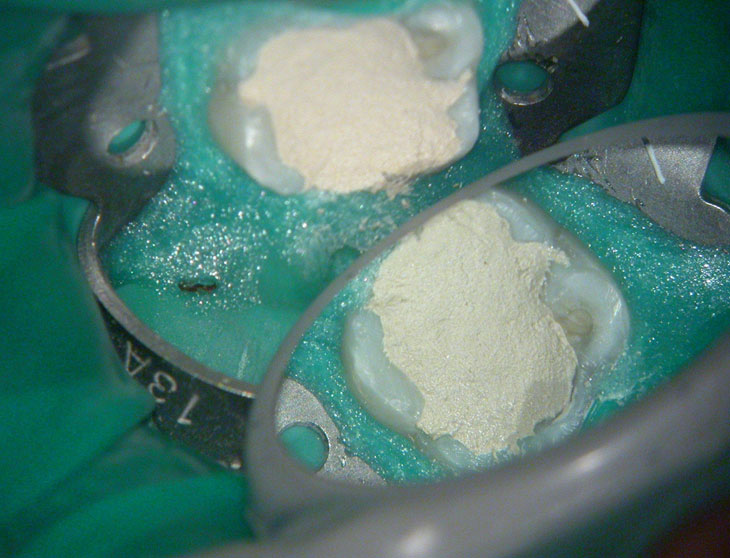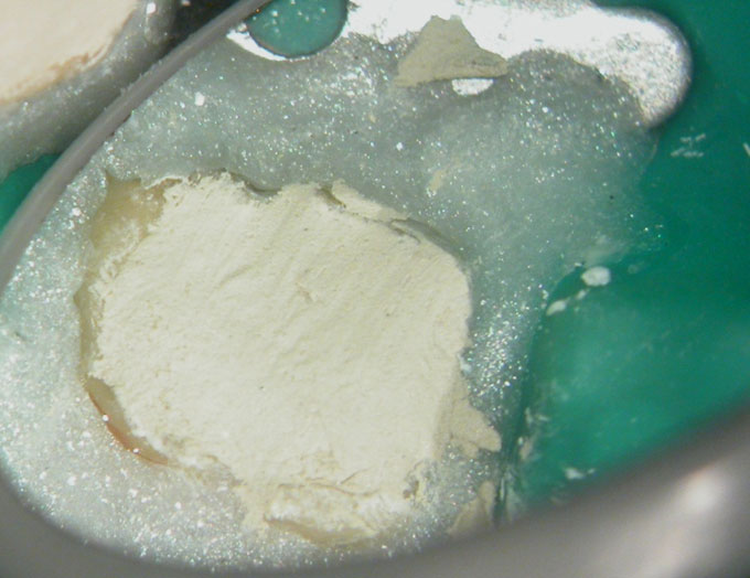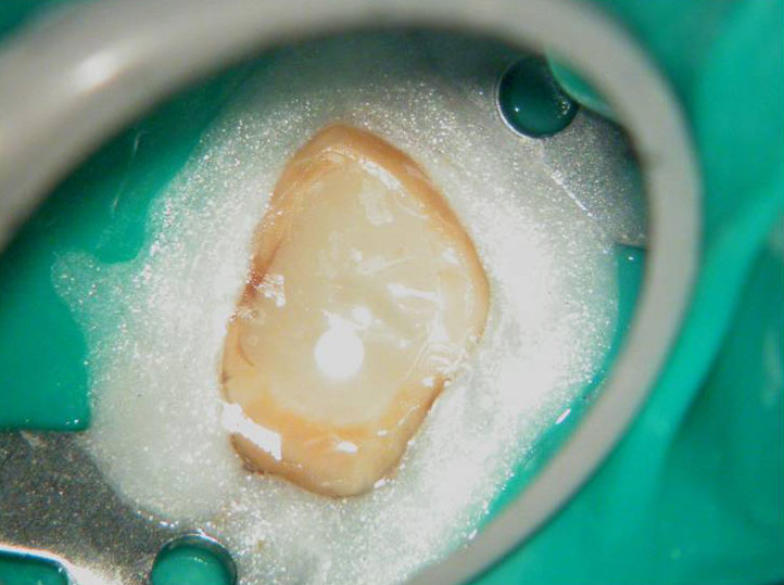 Central incisor: old root canal filling removed. Profuse bleeding from the apex seen. Apex is wide open. Canal cleaned and calcium hydroxide medicament placed.