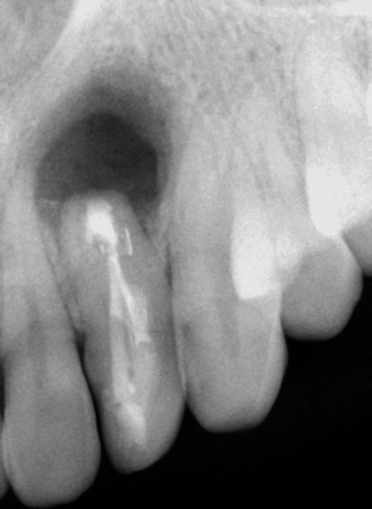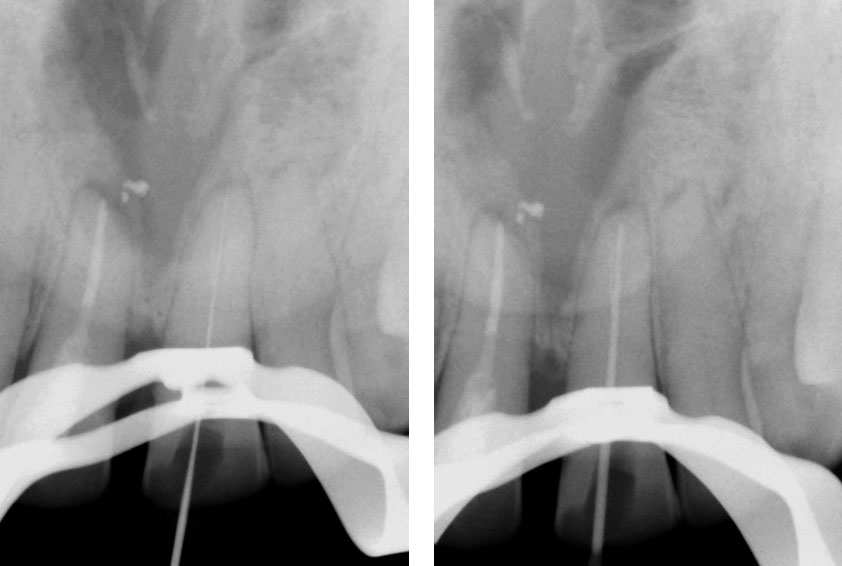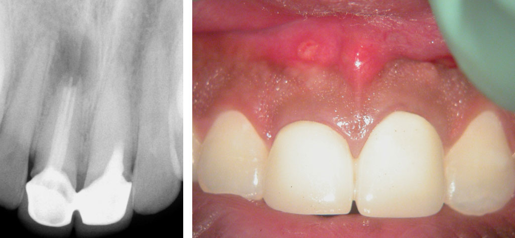 Persistent pain and swelling over the right central Incisor. Pain on palpation over the left central incisor. History of previous root canals and surgery done 3 years ago.