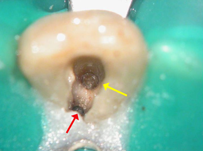 Removal of temporary restoration shows palatal perforation (red arrow) and a calcified canal in the middle (yellow arrow)