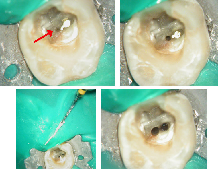 Red arrow shows calcification covering the MB2. Removal of this calcification with ultrasonics reveals the missed MB2(yellow arrow)