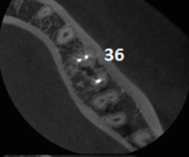 Red arrows show the two “white spots” indicating the calcified mesial canals.